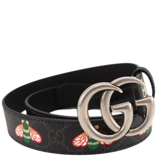 GUCCI Double G Buckle Marmont Bee Print Leather Belt Black 411516 Size 95.38