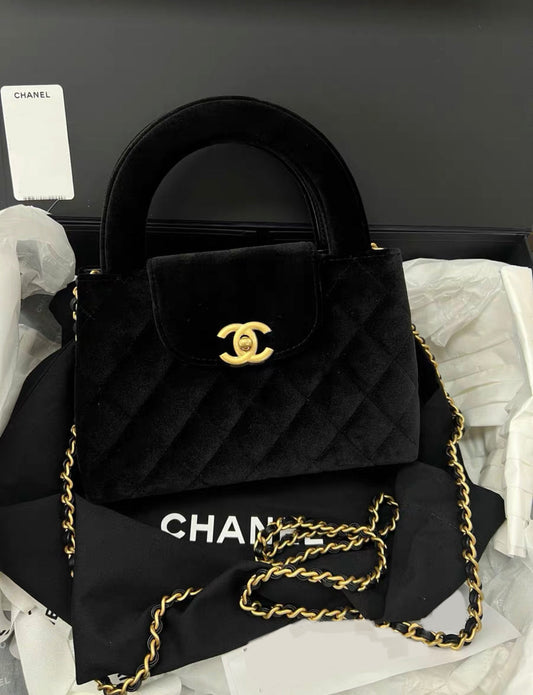 24A CHANEL KELLY Black VELVET Top Handle Shopping Bag Handbag Gold