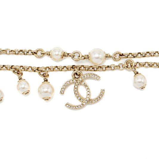 Chanel Double Chain Bracelet with CC logo and pearl light gold tone