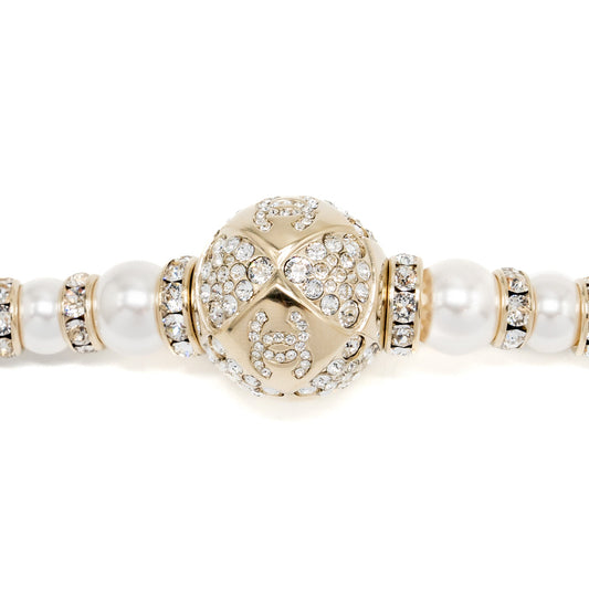 Chanel Crystal & Pearl CC Logo Bracelet Light Gold Tone