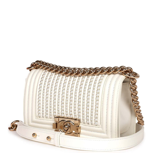 Chanel Small Boy Bag White Calfskin with Imitation Pearls Light Gold Hardware
