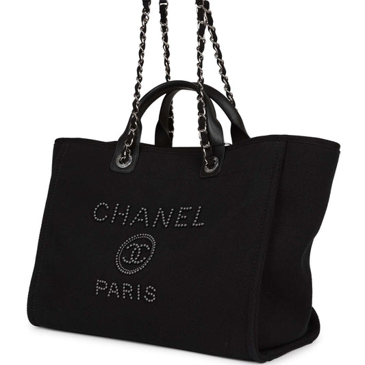Chanel Large Deauville Shopping Bag Imitation Pearl and Black Canvas Silver Hardware