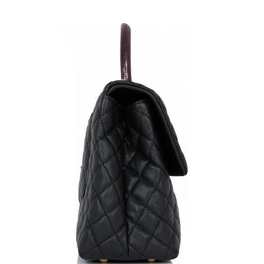 Chanel Large Coco Handle Flap Bag Black Caviar Lizard Handle Antique Gold Hardware
