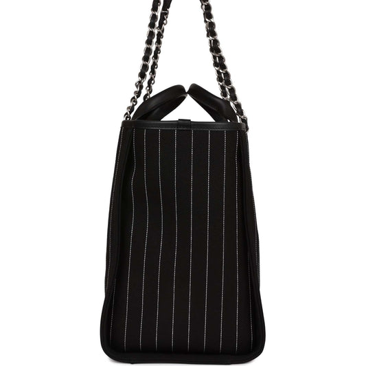 Chanel Large Deauville Shopping Bag Black and White Pinstripe Ruthenium Hardware