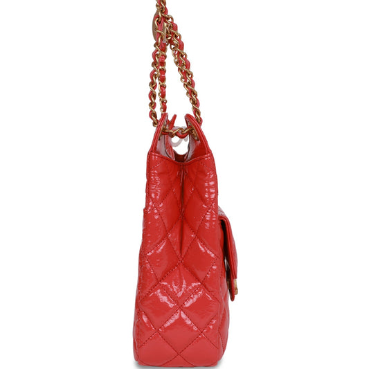Chanel Quilted CC Hobo Bag Red Shiny Crumpled Calfskin Antique Gold Hardware