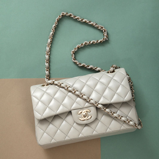 Chanel Small Light Gray Quilted Lambskin Double Flap Classic