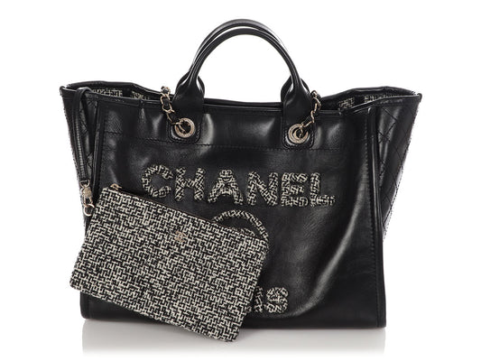 Chanel Large Black Leather Calfskin and Tweed Deauville Tote