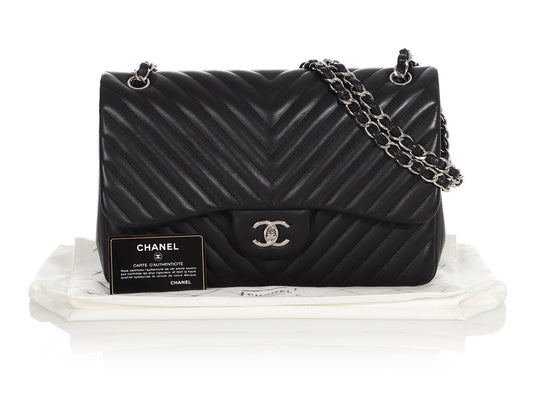 Chanel Jumbo Black Chevron-Quilted Lambskin Classic Double Flap