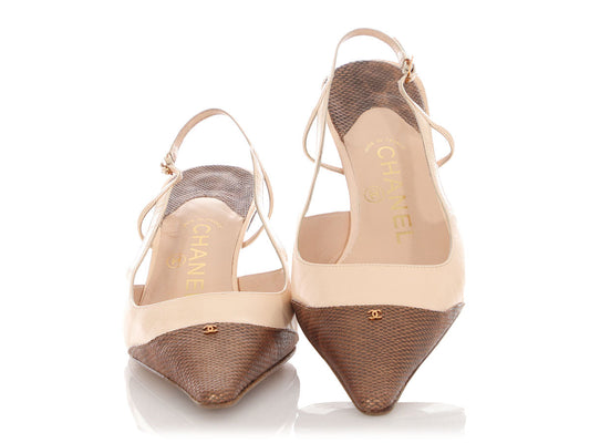 Chanel Light Pink Lizard Embossed Cap Toe Slingbacks