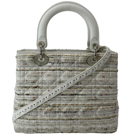 CHRISTIAN DIOR Medium Lady Dior Tweed Leather Shoulder Bag White