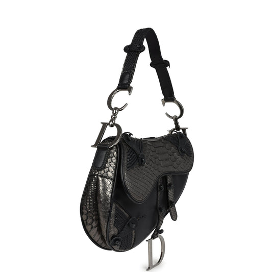 Vintage Christian Dior Saddle Bag Gunmetal Python and Black Leather Silver Hardware