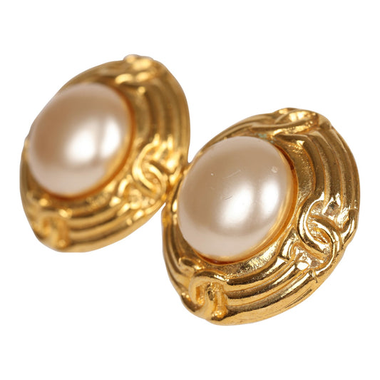 Chanel Vintage 24K Gold Plated CC Round Pearl Earrings Gold Hardware