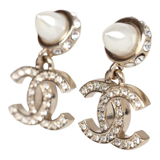 Chanel Light Gold Faux Pearl Crystal Coco Script CC Drop Earrings