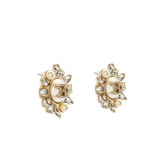 Chanel Giant Geometric CC Logo Earrings Pearl/Crystal Light Gold Tone