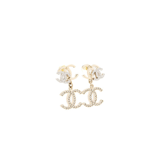 Chanel Crystal and CC Logo Drop Earrings Light Gold Tone