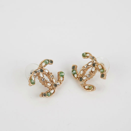 Chanel Coco Logo Green Pearl Rhinestone Earrings Costume Jewellery