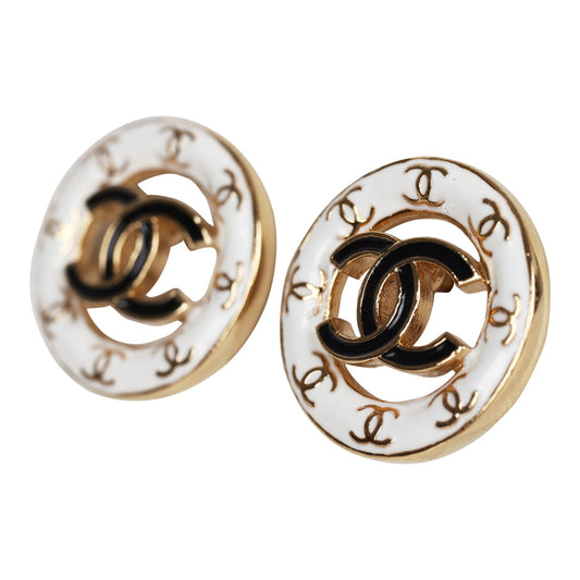 Chanel CC Round Stud Earrings White/Black Enamel Gold Hardware