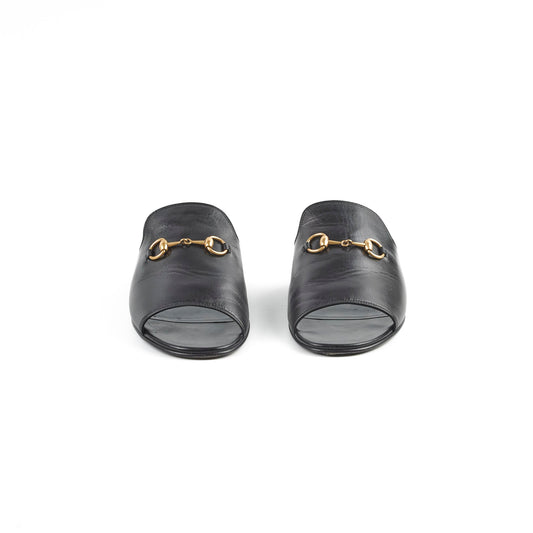 Gucci Black Leather Horsebit Malaga Kid Flat Slides