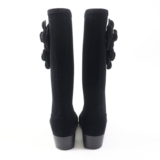 Chanel Camellia Velour Low Heel Boots Black