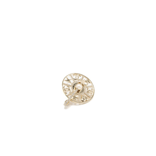 Chanel Strass spinning wheel pin brooch with Crystal / pearl Light Gold tone