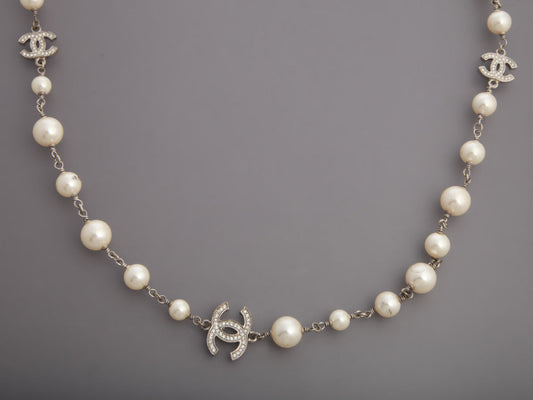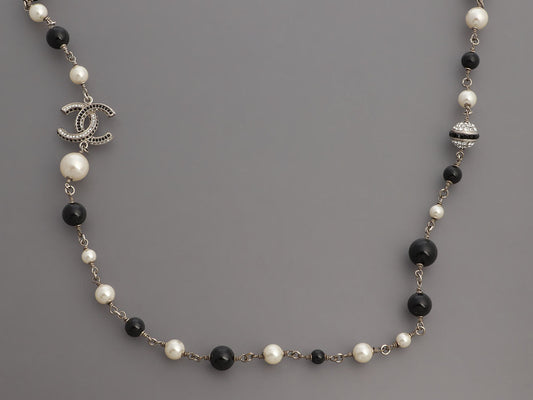 Chanel Long Black Beads, Pearls, and Crystal Logos Necklace