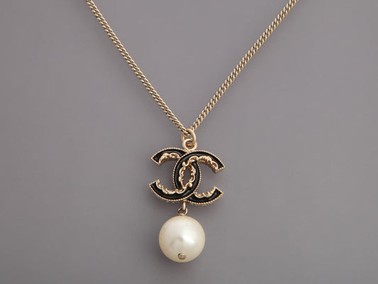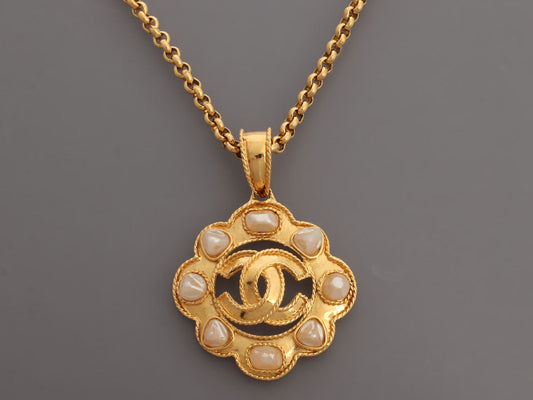 Chanel Vintage Long Pearl Logo Medallion Pendant Necklace
