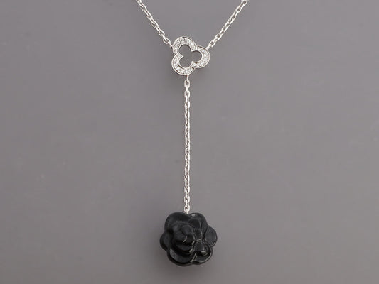 Chanel 18K White Gold Diamond and Black Onyx Camélia Sculpté Drop Necklace