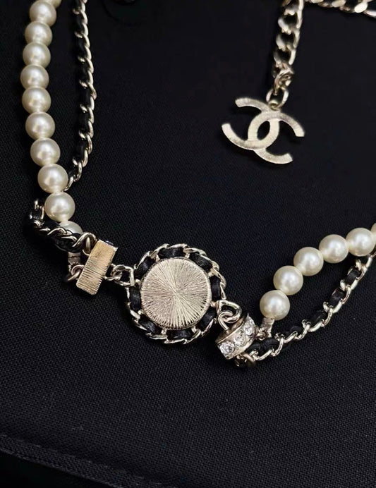 Chanel 21K Leather Chain Pearl Double Layer Necklace Choker