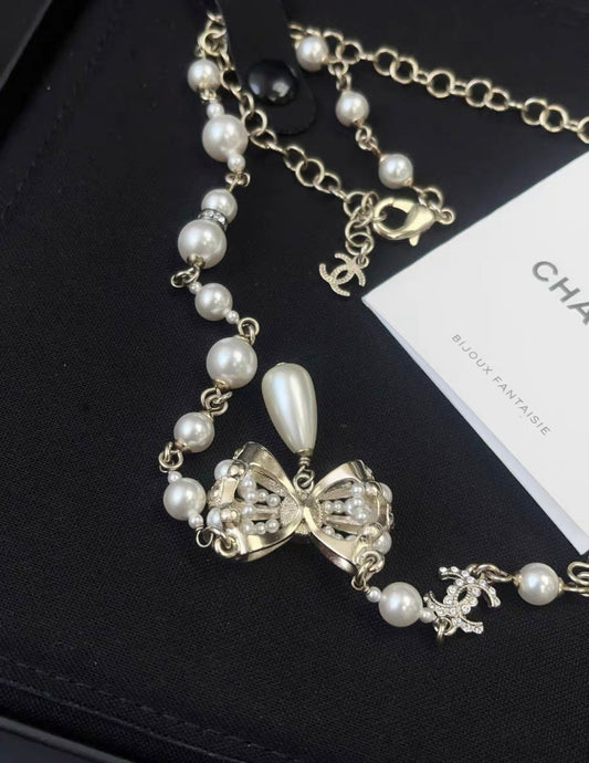 Chanel 20SS Bow Necklace in Stainless Steel with Faux Pearl and Rhinestone