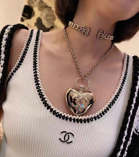 Chanel Strass and Pale Gold Metal CC Heart Necklace, 2020
