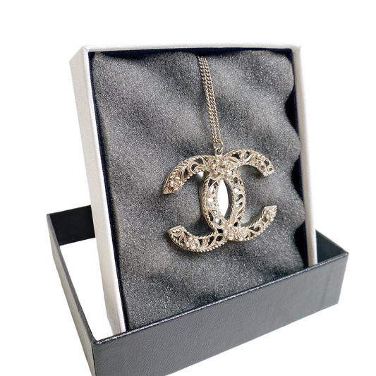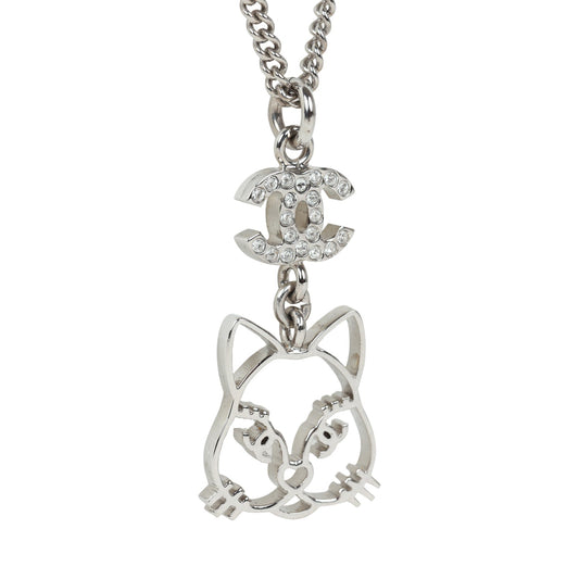 Chanel Silver CC Crystal Choupette Cat Emoji Pendant Necklace