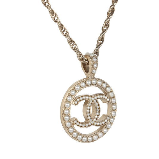Chanel Round CC Pearl Pendant Necklace Light Gold Hardware