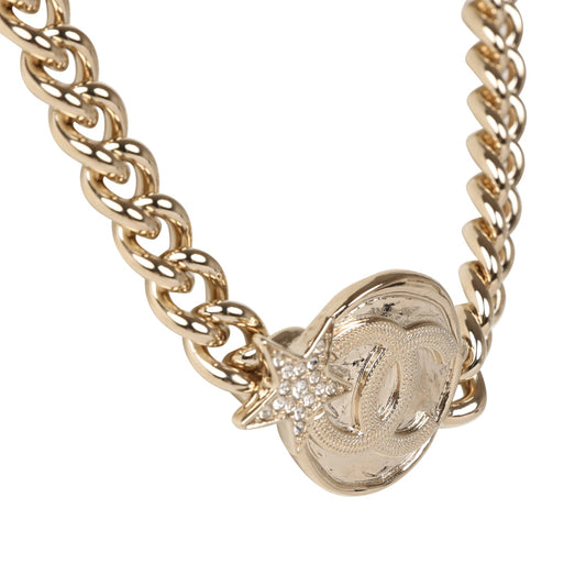 Chanel Light Gold Tone Wax Seal Logo and Rhinestone Star Necklace