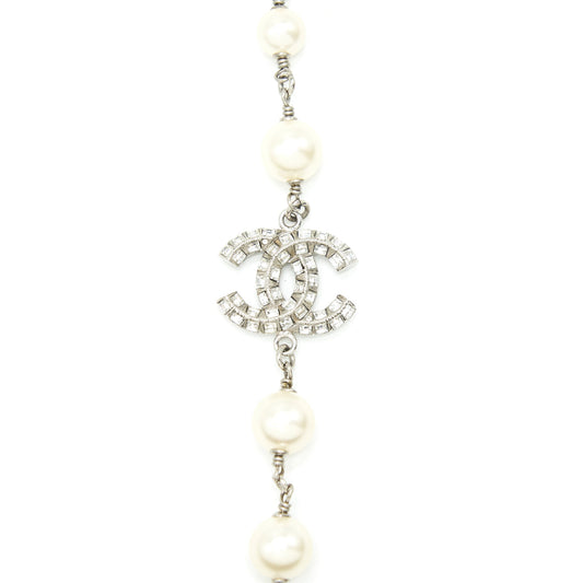 Chanel CC Logo And Pearl Long Necklace Silver Tone
