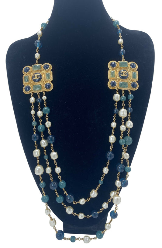 Chanel 11A Paris-Byzance 3 Strand Pearl Medallion Gold Green Blue Necklace/Belt