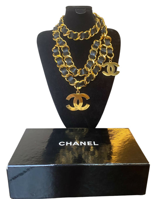 Iconic Vintage Chanel 93P Jumbo Gold Chain CC Logo Black Leather Belt Necklace
