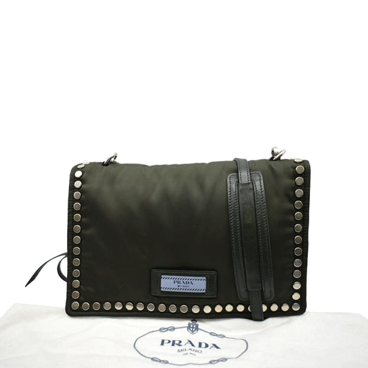 PRADA Tessuto Studded Etiquette Nylon Shoulder Bag Olive Green