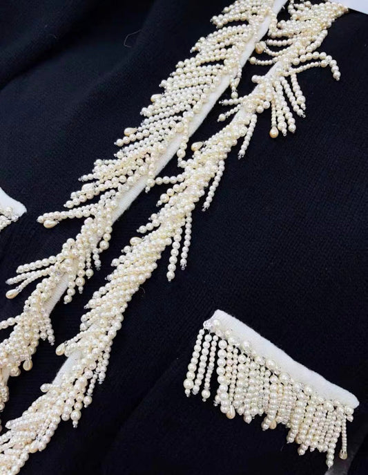 Chanel 21k Black & Ecru Cardigan with Pearl fringe size 36