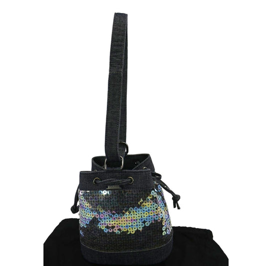 CHANEL Sequin Denim Small Drawstring Bucket Bag Blue