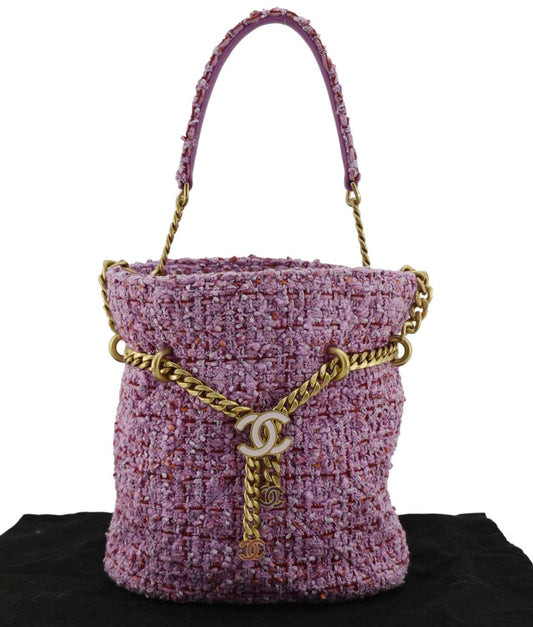 CHANEL Pending CC Tweed Enamel Drawstring Tote Bucket Bag Pink