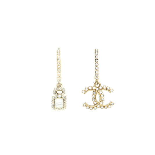 Chanel 21K Pearl CC And Perfume Bottle Charm Drop Earrings