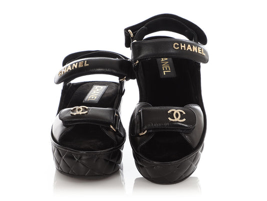 Chanel Black Quilted Velcro Strap Wedge Sandals