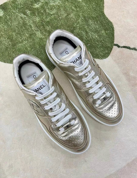 CHANEL 24C CC LEATHER SNEAKERS 38 GOLD