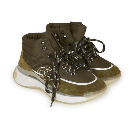 Chanel CC Hightop Winter Sneakers Olive Green Nylon and Suede 35