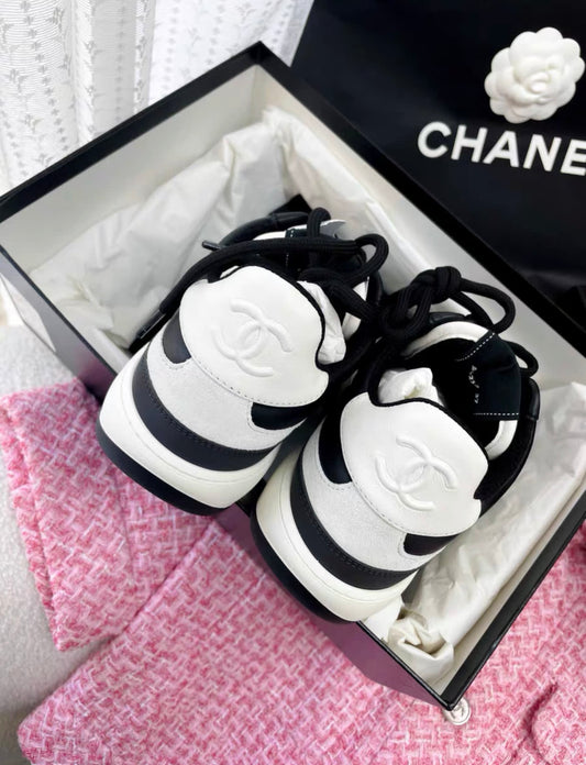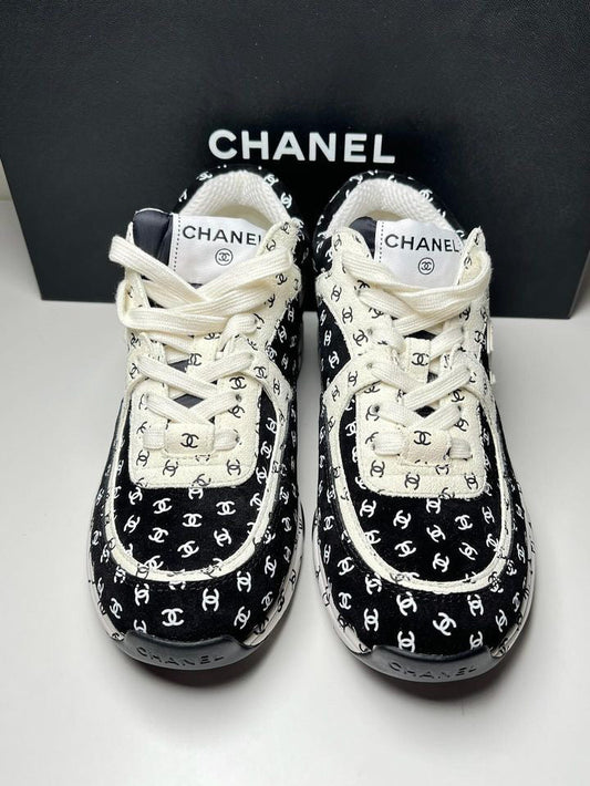 CHANEL White Black suede CC Logo Trainers Sneakers size 37C full set