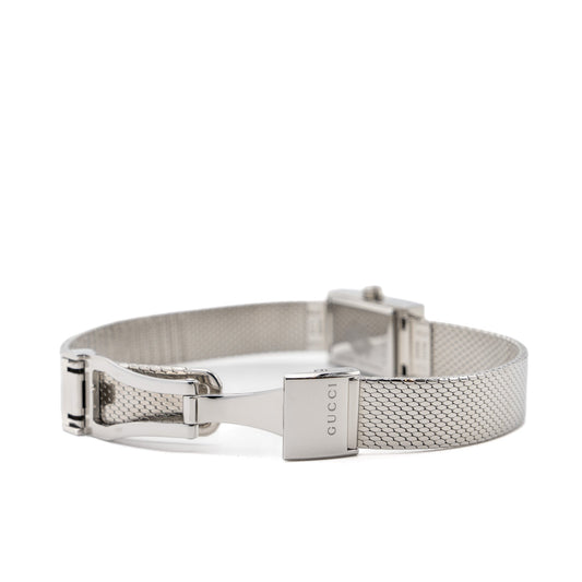 Gucci G-Frame Watch Steel case, green-red-blue web dial, steel mesh bracelet