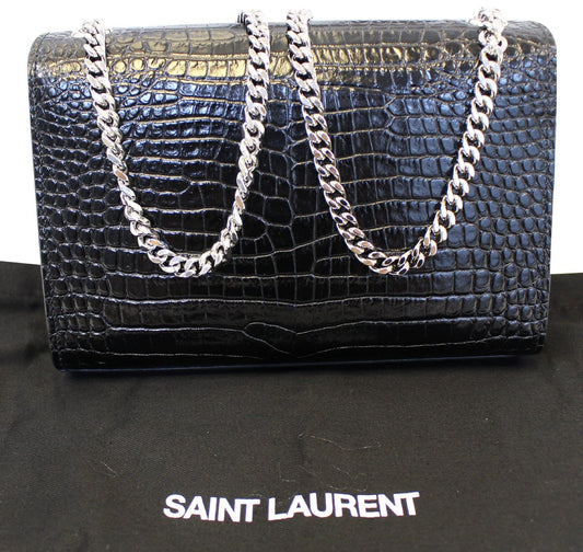 YVES SAINT LAURENT Crocodile Black Leather Silver Chain Clutch Crossbody Bag