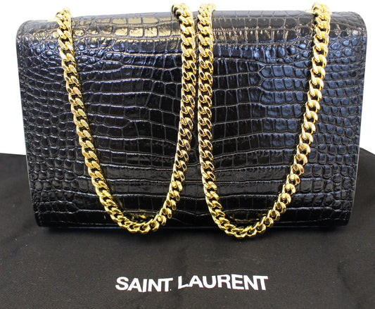 YVES SAINT LAURENT Crocodile Black Leather Gold Chain Clutch Crossbody Bag