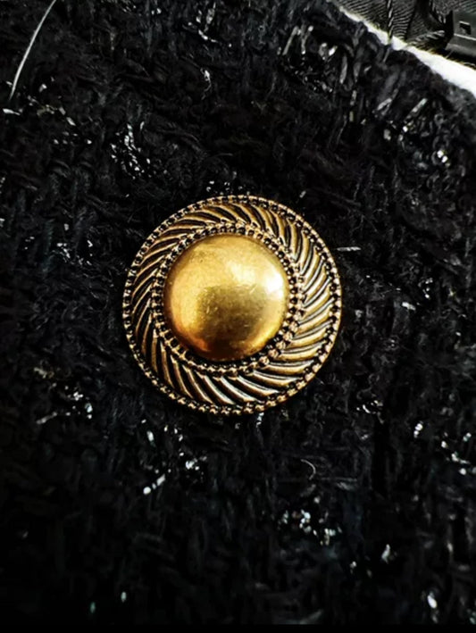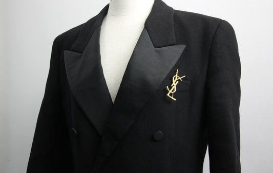 Saint Laurent Black Tuxedo Coat In Grain De Poudre + Saint Laurent YSL Logo Twisted Stripe Texture Brooch