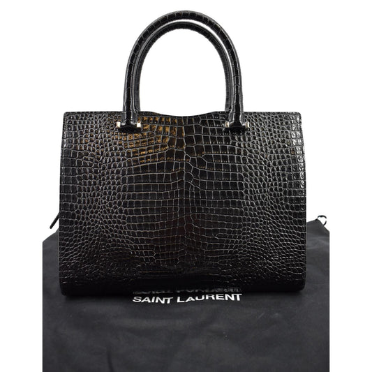 YVES SAINT LAURENT Uptown Crocodile Calfskin Embossed Tote Bag Black